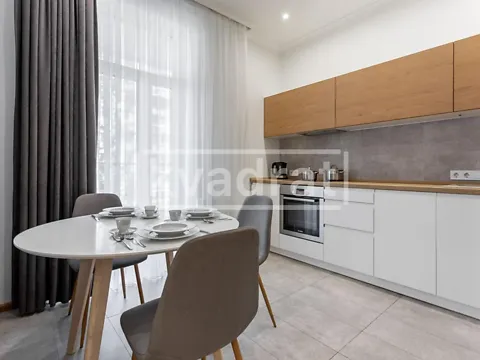 В квартире выполнен дизайнерский ремонт в спокойных тонах с использованием высококачественных материалов, полностью укомплектована всей необходимой мебелью и бытовой техникой.