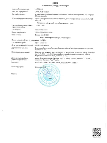 Земельный участок сельскохозяйственного назначения коммунальной собственности площадью 1.4004 га, кадастровый номер 5323282200:00:001:0032, место расположения: Полтавская область, Миргородский район, Миргородская городская территориальная громада.