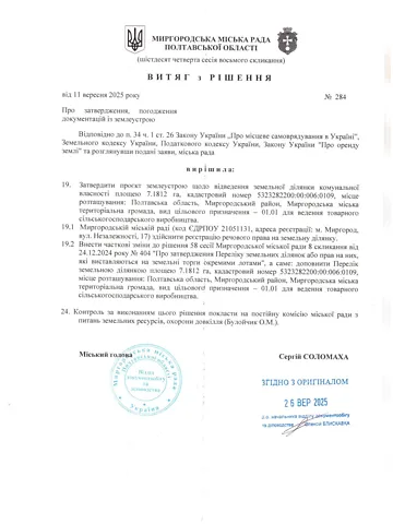 Земельный участок сельскохозяйственного назначения коммунальной собственности площадью 0.4400 га, кадастровый номер 5323285200:00:006:0204, место расположения: Полтавская область, Миргородский район, Миргородская городская территориальная громада.