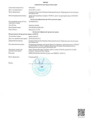 Земельный участок сельскохозяйственного назначения коммунальной собственности площадью 2.1812 га, кадастровый номер 5323282200:00:006:0108, место расположения: Полтавская область, Миргородский район, Миргородская городская территориальная громада.