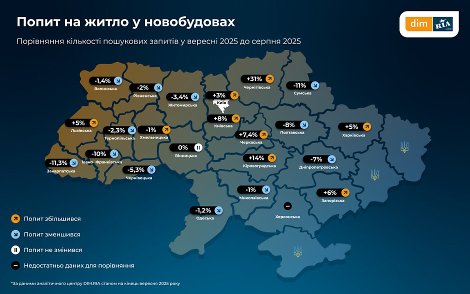Попит на новобудови серед користувачів у вересні залишався нестабільним. Найбільший приріст попиту помічено у Чернігівській (+31%) та Кіровоградській (+14%) областях. А найістотніше зменшення — на Закарпатті (-11,3%), Сумщині (-11%) та Івано-Франківщині (-10%).