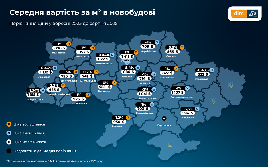 У значній частині регіонів спостерігається зростання вартості квадратного метра. Київ залишається найдорожчим містом: середня вартість квадратного метра у столиці — $1 411/м². Найнижчі ціни — у прифронтових регіонах, таких як Сумська та Запорізька області.