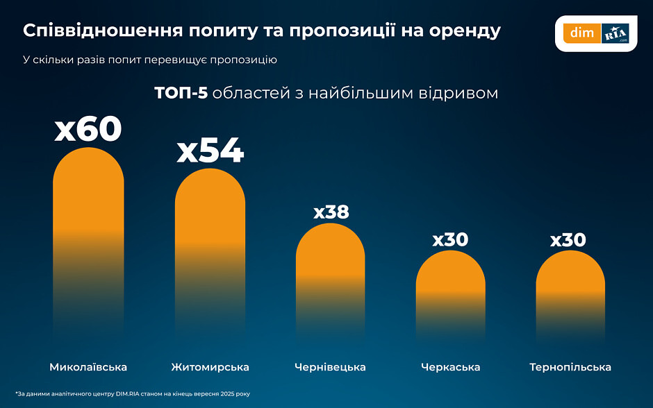 Співвідношення кількості оголошень про оренду та кількості відгуків на них у серпні для Києва становить 1:7, тоді як у більшості областей ці показники відрізняються у рази: найвищий дисбаланс у Миколаївській (1:60) та Житомирській (1:54) областях.