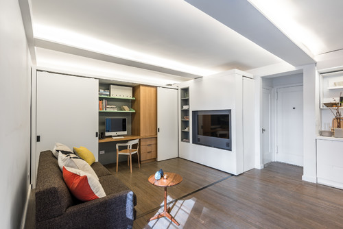 Скользящая стена может передвигаться в различные положения вручную или с помощью электродвигателя. Хозяин включает переключатель и перемещает стенку в нужное ему положение. «Такое решение добавило нашему проекту некоторую уникальность», говорит Чен. Мотор был разработан и сделан на заказ компанией Trak-Kit. Сама конструкция состоит из алюминиевой рамы, которая представляет собой основу стенки. Снаружи она обшита листами фанеры и МДФ, покрытыми сатиновым лаком. Чен пришел к выводу, что в таком небольшом помещении размещение на потолке обычных осветительных приборов лишь «украдет» часть и без того дефицитного свободного пространства. Вместо этого, в потолок комнаты были вмонтированы мощные полосковые светодиодные лампы. Каналы под них были специально углублены в потолочное перекрытие. «Свет льется с потолка вниз, создавая в квартире мягкое, ненавязчивое освещение, которое появляется как бы из ниоткуда», говорит архитектор.