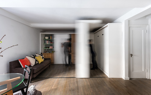 Архитектор откликнулся на просьбу профессора, изготовив на заказ передвижную стену со встроенным телевизором, которая может использоваться для разных нужд. Хозяин квартиры может передвинуть ее в одну часть жилой комнаты и получит свободное пространство для развлечений. Отодвинет ее в другую сторону, и у него выйдет перегородка для спальни. Телевизор вращается таким образом, что его можно смотреть с одной стороны, сидя на диване или с другой, лежа на кровати.