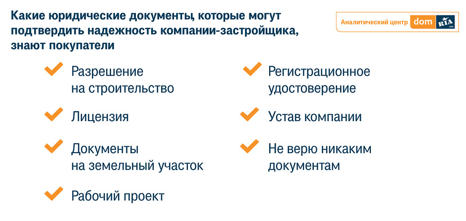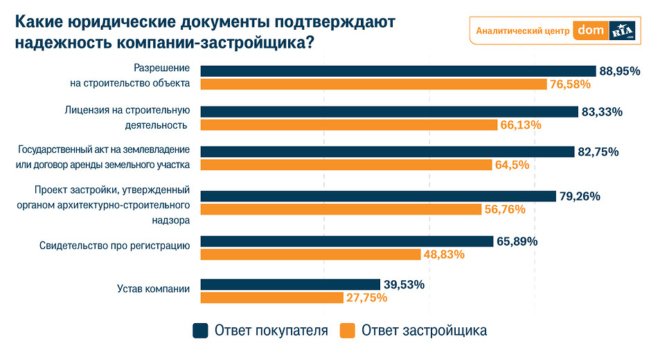 Далее респондентам предложили выбрать из предложенного списка юридические документы, которые подтверждают надежность компании-застройщика. Согласно результатам опроса, в ТОП-3 документов, попали разрешение на строительство объекта, лицензия на строительную деятельность, государственный акт на землевладение или договор аренды земельного участка. Такие же документы выбрали и компании-застройщики.