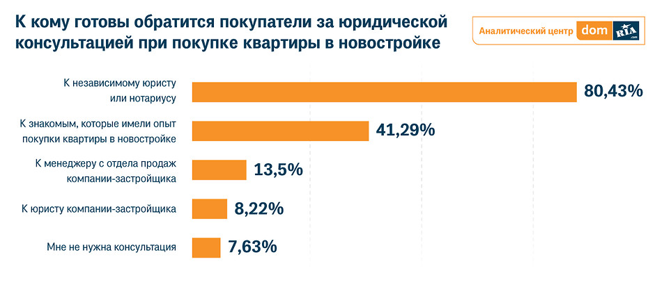 Аналитики также решили узнать, к кому готовы обратиться покупатели за юридической консультацией. Респондентам предложили выбрать один вариант ответа. Среди всех предложенных вариантов, первенство получил — независимый юрист или нотариус. И здесь, без сомнения, это действительно самый правильный выбор. А вот следующий вариант, который занял второе место в рейтинге, вызывает ряд дополнительных вопросов. Конечно, лишним никогда не будет узнать об опыте покупки квартиры у своих знакомых, но положиться только на опыт другого — это рискованно.
