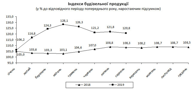 Так, в январе-августе 2019 г. по сравнению с январем-августом 2018 г. индекс строительной продукции составил 120,8%. В то же время самый высокий показатель был зарегистрирован в январе-апреле 2019 г. По сравнению с аналогичным периодом 2018 г. он составил 128,1%.