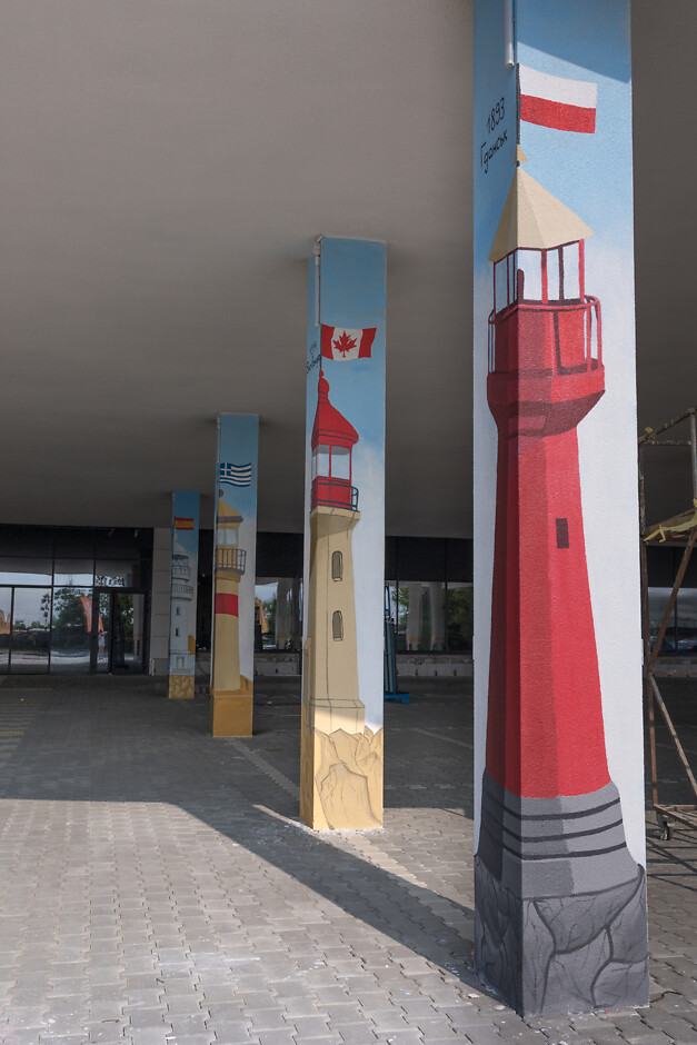 На площі біля самого ТРЦ розташувалися сім колон, сюжети яких відтворюють справжні маяки міст-побратимів-партнерів Одеси у світі — Пірею, Стамбулу, Ванкувера, Гданська, Клайпеди, Ларнаки та Пірею. Це унікальні малюнки, аналогів яким немає і які з душею створили одеські художниці.