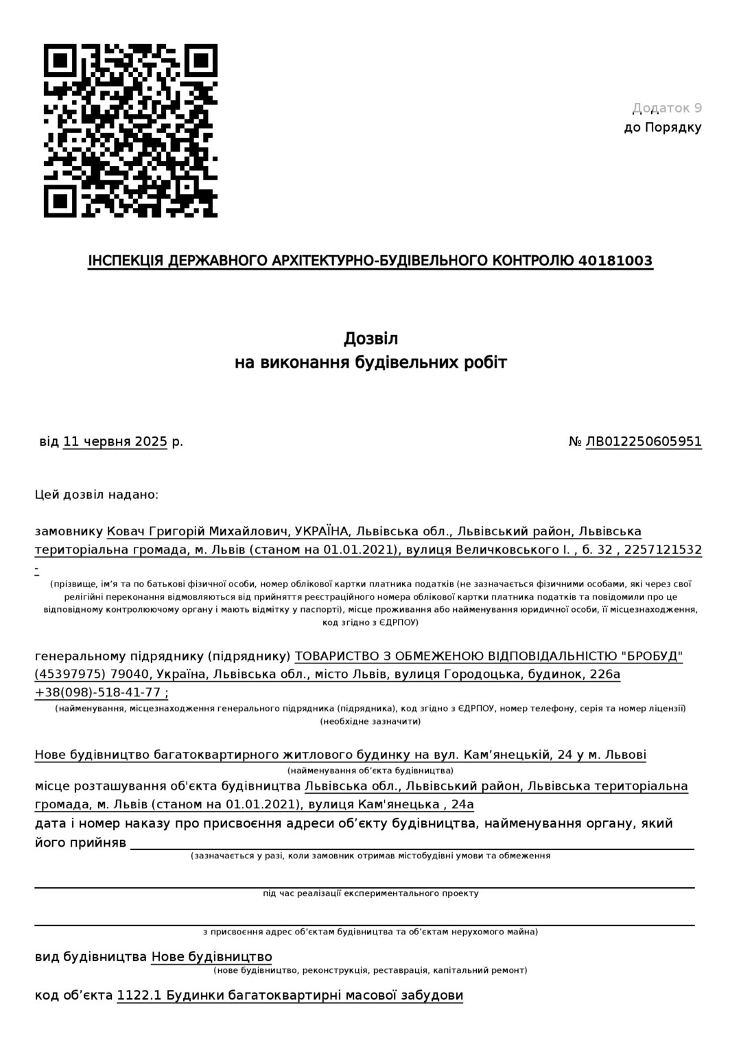 Документы на строительство Разрешение на выполнение строительных работ ЛВ012250605951 |