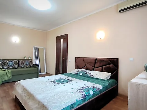 7/14 этаж, 35 кв.м. Укомплектована полностью качественной мебелью и техникой. Спальных мест 2 дивана 2 спальных. В наличии индукционная плита, посуда, интернет, Смарт ТВ, постель. Красивый вид на город.