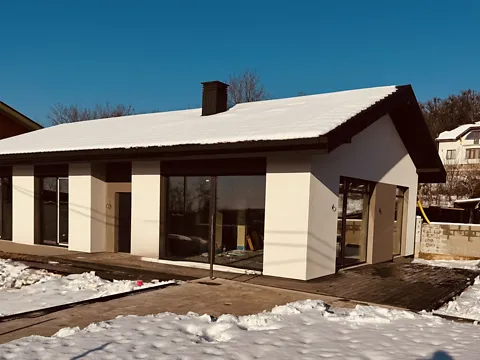 Цегла, 38 см + 10 см утеплення. Площа 130 кв.м., три кімнати, 2 санвузла, тераса 26 кв.м.