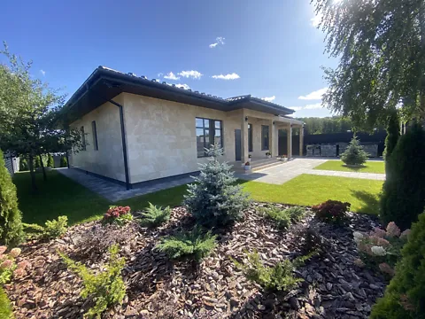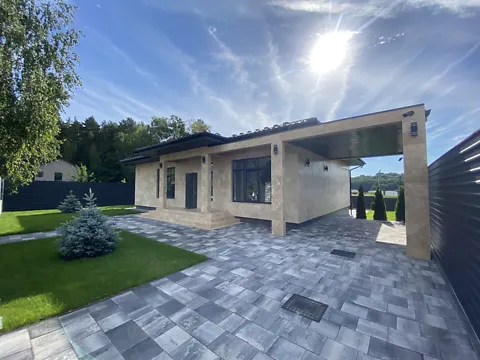 Одноповерховий котедж у лісовій частині. Ділянка 8, 6 соток. Рік побудови будинку 2021 року. Площа будинку 184м2. Крита тераса 28м2, навіс під машини 23м2.