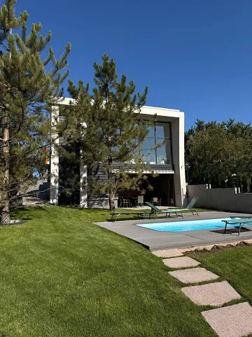 Современный дизайнерский дом с садом, баней, спуском к реке и уютной атмосферой, беседкой и роскошным зеленым пейзажем.