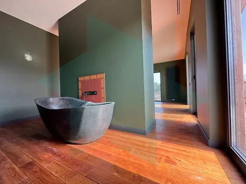 1-й этаж: топочная, просторная кухня-гостиная, санузел, гардеробная, выход на террасу, спальня со своим санузлом и гардеробной. Гараж.