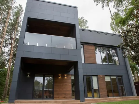 Фасад из каменистого шпона, стекло, дерево.