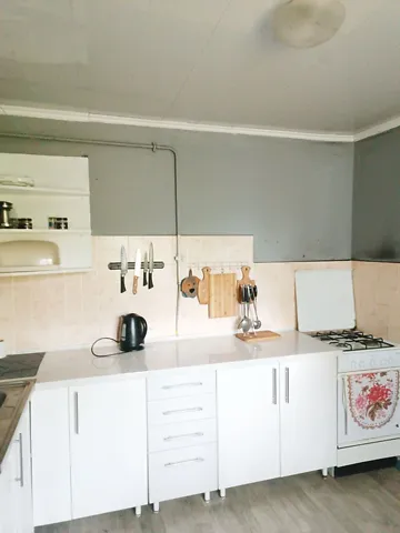 Основной дом разделен на два входа, высота потолка 2, 5 м. Есть теплый пол в кухне и ванной комнате, деревянный пол (линолеум). Установлены металлопластиковые окна.