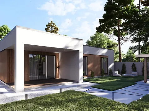 В будинку 3 спальні кімнати, санвузол, гардеробна кімната і кухня-вітальня.