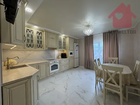 Просторная кухня-студия плавно переходит в зону гостиной, создавая открытый и светлый пространство.