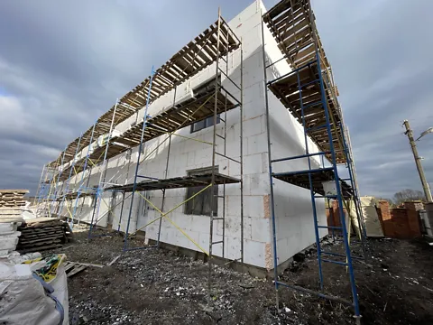Будинок в чорновому стані, утеплений ззовні, бетонний паркан.