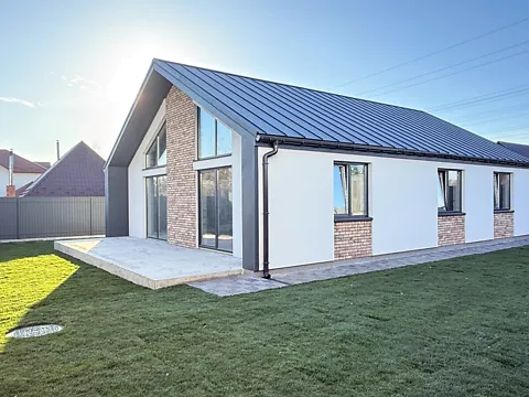 Елегантний котедж з панорамними вікнами, підземним паркінгом на два авто та гаражем. Будинок утеплений і облицьований клінкерною цеглою. Простора тераса з видом на облагороджену ділянку.