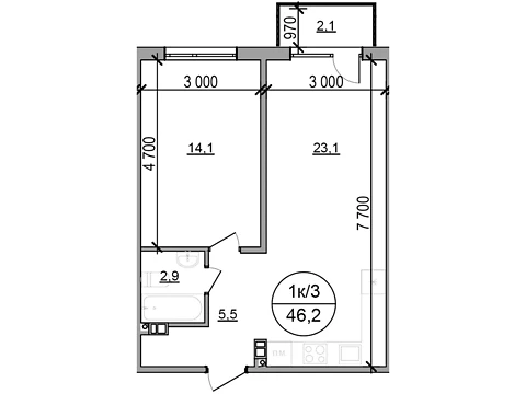 Эта современная комфортная планировка 1-комнатной квартиры с зонами для досуга и работы. Площадь 1-комнатной квартиры - 46.2 м².