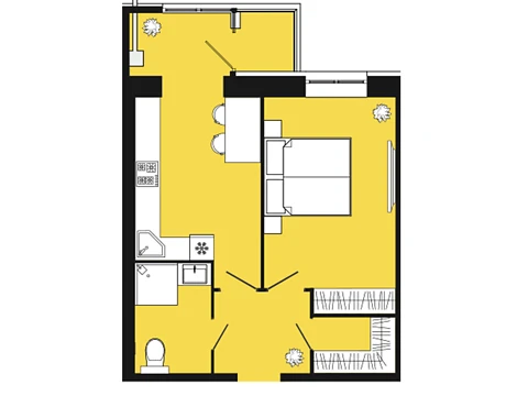 Планировка: кухня-гостиная с лоджией, спальня, смежный санузел с ванной.