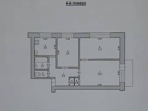 Цегла, площа 66.6 м2, кухня 8, 5 м2, на 5-у поверсі 5-ти поверхового будинку.