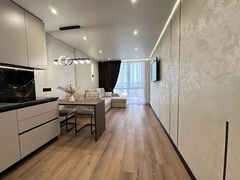 Общая площадь составляет 42.5 кв.м. Жилая площадь 15 кв.м. 20 кв.м. площадь кухни. Санузел смежный. Помещение с евроремонтом. Входная бронированная дверь. С большим балконом. С подогревом пола. В помещении панорамные окна.