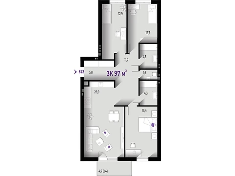 Площадь 3-комнатной квартиры - 97 м². Квартира расположена на 2 этаже 6-и этажного дома.