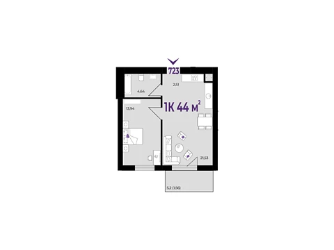 Площадь жилья данной планировки 44 м².