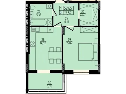 Площадь 1-комнатной квартиры - 52.65 м². Квартира расположена на типовом этаже 10-и этажного дома.