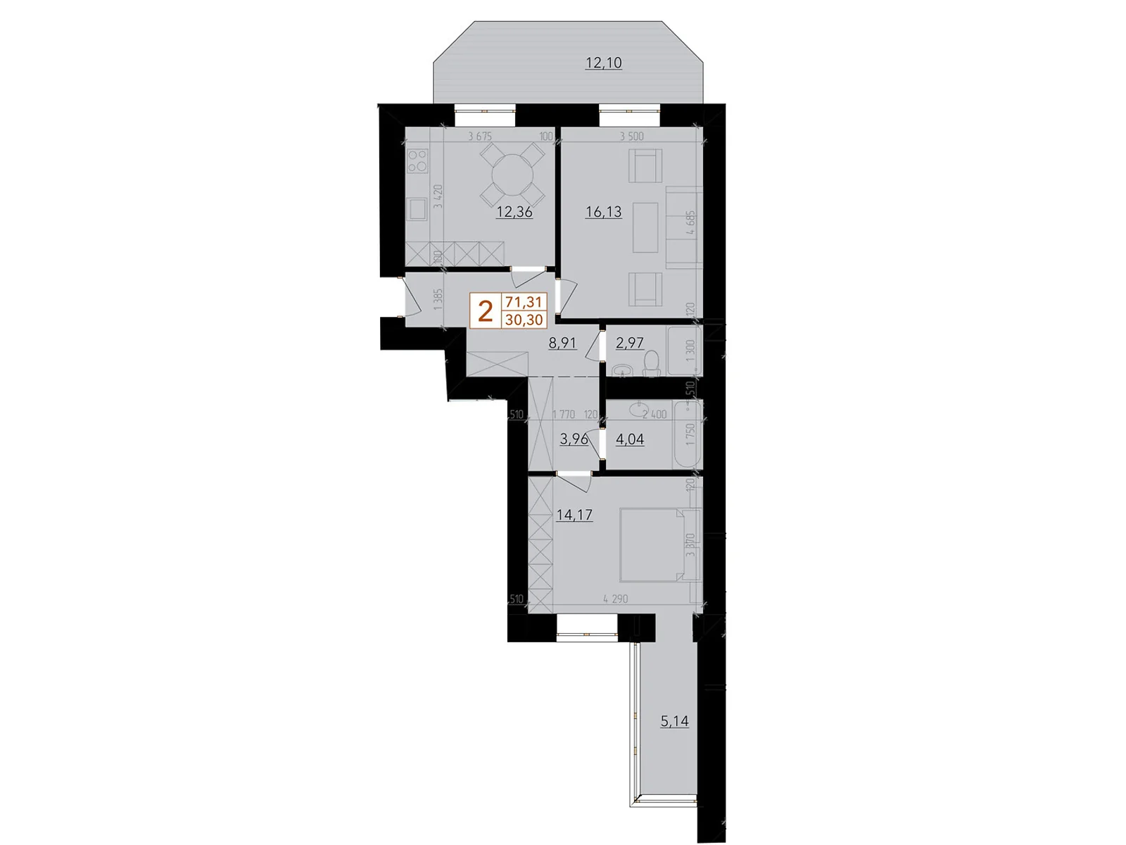 Эта современная комфортная планировка 2-комнатной квартиры с зонами для досуга и работы.