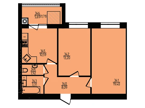 Площадь жилья данной планировки 69.23 м².