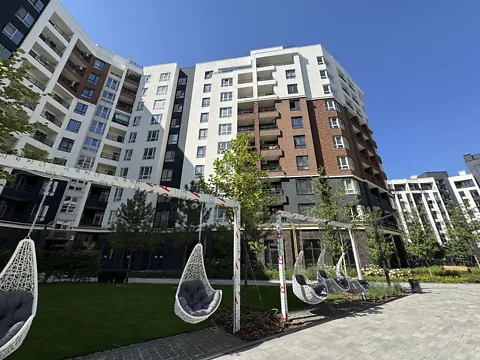 Жилой комплекс города, современная, придомовая территория. Зоны для отдыха, детские площадки.