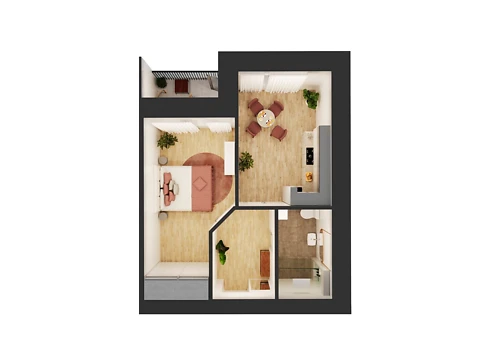 Эта современная комфортная планировка 1-комнатной квартиры с зонами для досуга и работы. Площадь 1-комнатной квартиры - 44.49 м².