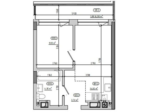 Эта современная комфортная планировка 1-комнатной квартиры с зонами для досуга и работы. Площадь 1-комнатной квартиры - 34.09 м².