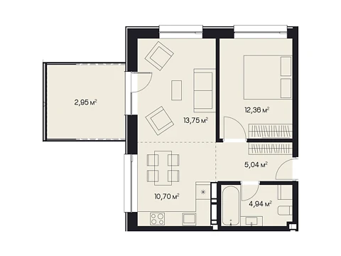 Эта современная комфортная планировка 1-комнатной квартиры с зонами для досуга и работы. Площадь 1-комнатной квартиры - 49.75 м².