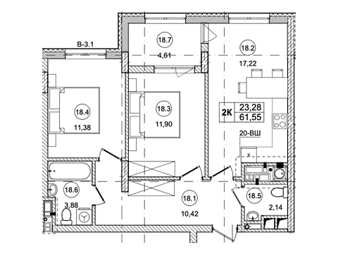 Площадь 2-комнатной квартиры - 61.5 м². Квартира расположена на 4 этаже 8-и этажного дома.