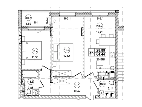 Площадь жилья данной планировки 64.4 м².