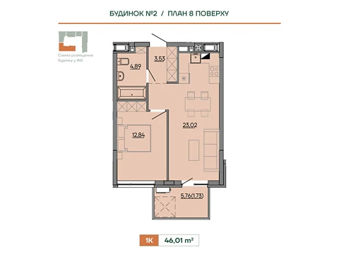 Площадь 1-комнатной квартиры - 46.01 м². Квартира расположена на 8 этаже 8-и этажного дома.
