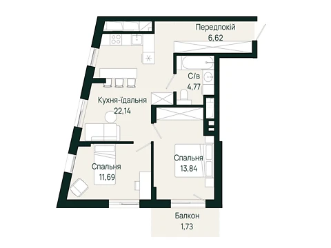 Площадь 2-комнатной квартиры - 58.86 м². Квартира расположена на 7 этаже 8-и этажного дома.