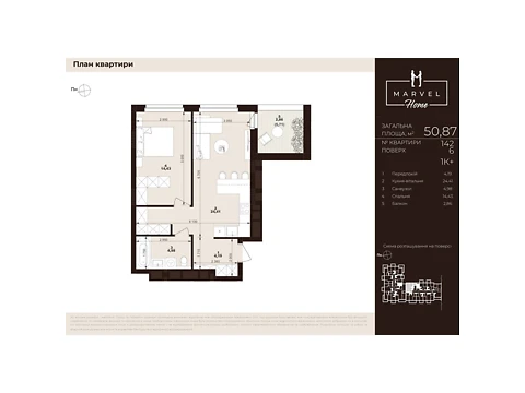 Площадь жилья данной планировки 50.87 м².