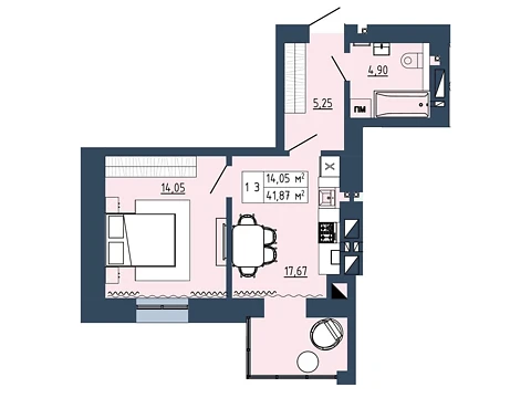 Эта современная комфортная планировка 1-комнатной квартиры с зонами для досуга и работы. Площадь 1-комнатной квартиры - 41.87 м².