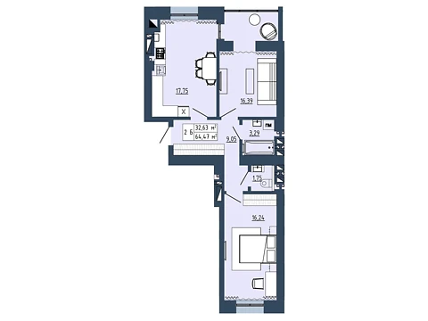 Площадь жилья данной планировки 55.79 м².