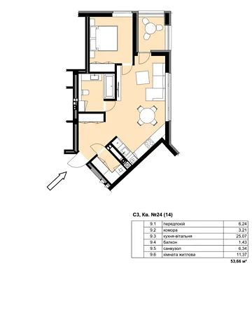 Однокомнатная квартира в новом ЖК "Central Park" в г. Мукачево, ул. Духновича 14. Планировка обеспечивает максимум функциональности жилого пространства при оптимальной площади. В квартире есть собственная кладовая и балкон.