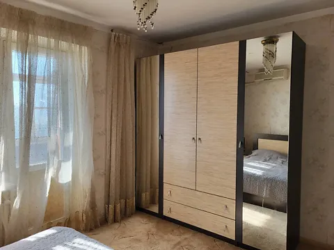 Id 23843 Квартира с ремонтом, три раздельные комнаты, спальня, детская, гостиная. В коридоре огромный зеркальный шкаф - купе. Встроенная кухня со все техникой. Плита - газовая. Духовка, микроволновка, холодильник, бойлер. На полу плитка. На потолке необычный декор. В спальне раскрытая лоджия.