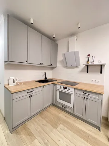 Просторная квартира 40 м2 распланирована на кухню-студию и две небольшие спальни (можно легко объединить в одну большую комнату).