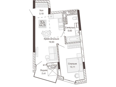 Площадь 1-комнатной квартиры - 41.7 м². Квартира расположена на 4 этаже 18-и этажного дома.