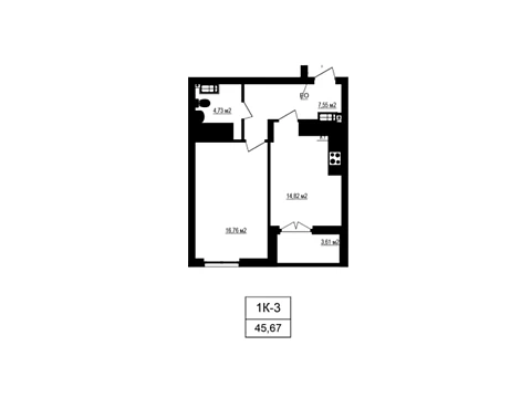 Площадь 1-комнатной квартиры - 45.67 м². Квартира расположена на 7 этаже 8-и этажного дома.